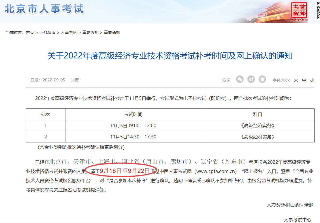 根据北京市人力资源和社会保障局公布的《关于2022年度高级经济专业技术资格考试补考时间及网上确认的通知》可知,2022北京高级经济师补考确认时间为9月16日至9月22日。