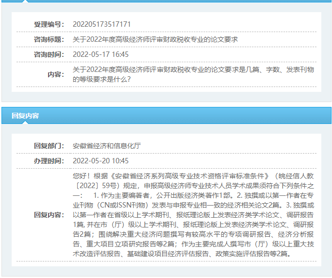 安徽省经济和信息化厅回复:根据《安徽省经济系列高级专业技术资格评审标准条件》(皖经信人教〔2022〕59号)规定,申报高级经济师专业技术人员学术成果须符合下列条件之一: