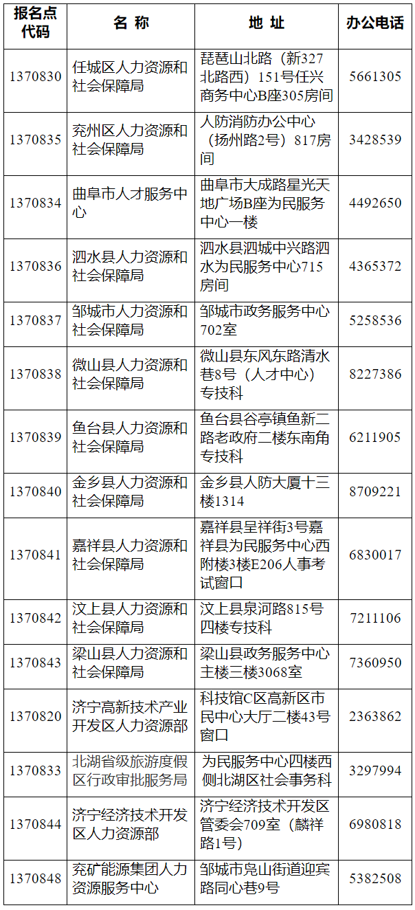 各县(市、区)人力资源社会保障局、济宁高新技术产业开发区人力资源部、济宁经济技术开发区人力资源部、北湖省级旅游度假区行政审批服务局、兖矿能源集团人力资源服务中心:
