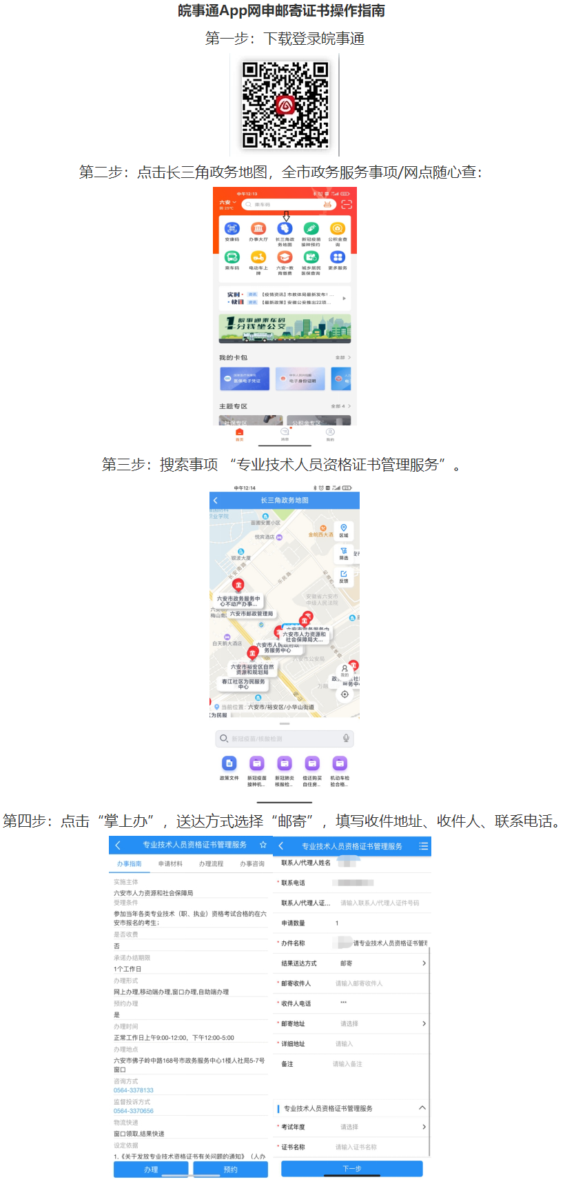 1.网申邮寄。考生下载皖事通App,进入“长三角政务服务地图”,搜索事项 “专业技术人员资格证书管理服务”,选择“邮寄”结果送达方式,提供准确的寄送地址及联系电话,填写考试年度和证书名称。系统审核后通过中国邮政速递免费寄送合格证明,证书仅支持本人当面签收。操作步骤请查看附件:皖事通App网申邮寄证书操作指南。