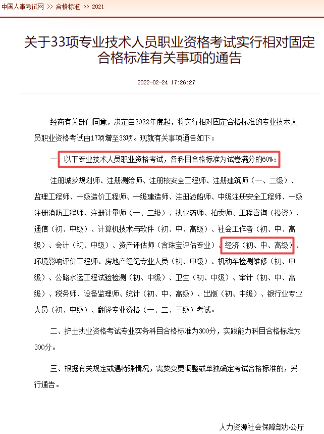 根据中国人事考试网发布的“关于33项专业技术人员职业资格考试实行相对固定合格标准有关事项的通告”可知,自2022年度起,高级经济师考试将实行相对固定合格标准,各科目合格标准为试卷满分的60%。