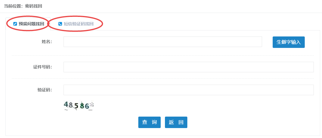 2、可以通过“预留问题找回”、“短信验证码找回”两种方式找回。