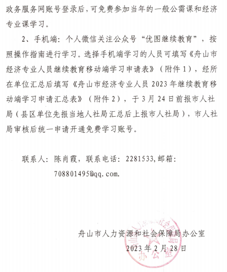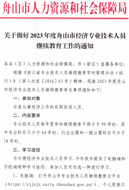 舟山市人力资源和社会保障局办公室关于做好2023年度舟山市经济专业技术人员继续教育工作的通知