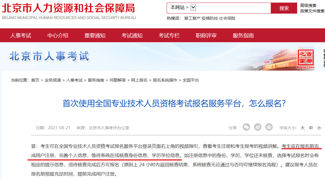 北京人事考试网官方回复:考生可在全国专业技术人员资格考试报名服务平台登录页面右上角的视频指引,查看考生注册和考生报考的视频讲解。考生应在报名前完成用户注册,完善个人信息,等待系统在线核查身份信息、学历学位信息。如注册信息中的身份、学历、学位还未核查,选择考试报名时会有相应的提示信息,须待核查完成后方可报名(原则上 24 小时内返回核查结果,系统核查无论通过与否均可继续报名流程)。建议报考人员在报名前预留充足时间,提前完成用户注册。
