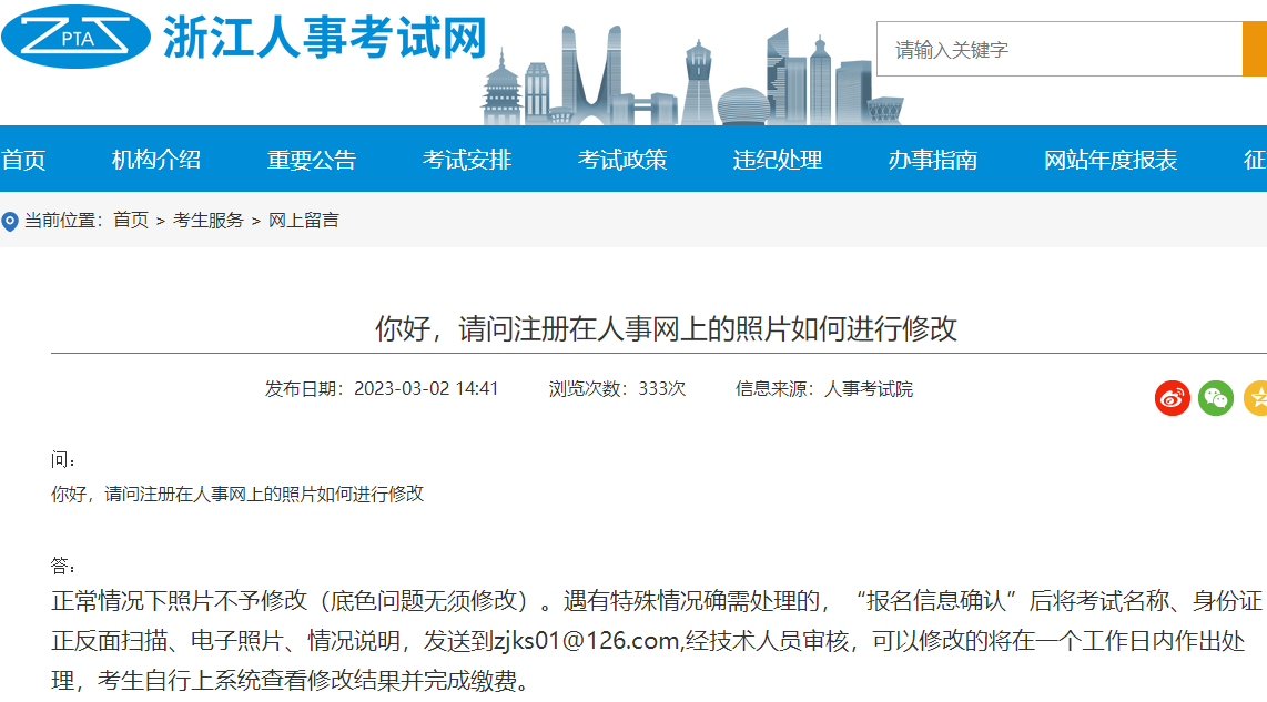 浙江人事考试网回复:正常情况下照片不予修改(底色问题无须修改)。遇有特殊情况确需处理的,“报名信息确认”后将考试名称、身份证正反面扫描、电子照片、情况说明,发送到zjks01@126.com,经技术人员审核,可以修改的将在一个工作日内作出处理,考生自行上系统查看修改结果并完成缴费。