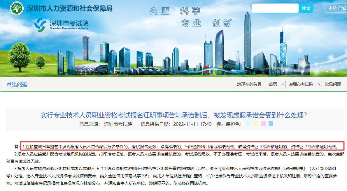 先来看深圳市人力资源和社会保障局的官方回复吧!报名无效、成绩无效、合格证明无效,记入考试诚信档案库,纳入全国信用信息共享平台,相关记录作为专业技术人员职业资格证书核发和注册、职称评定的重要参考。