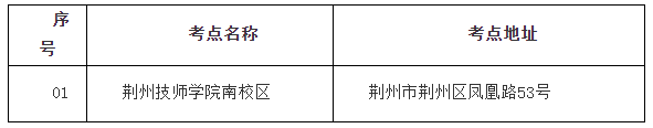 考点地址:荆州技师学院南校区(荆州区凤凰路53号,可乘15路公交车到工业学校站下车、可乘23路公交车到城南菜市场站下车)