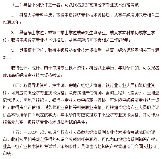 由上可知,大专学历,要取得中级经济师后有10年的工作年限;如果是研究生学历的话,也需要取得中级证书但工作年限相对减少5年。如果是博士学历,工作年限仅需2年。