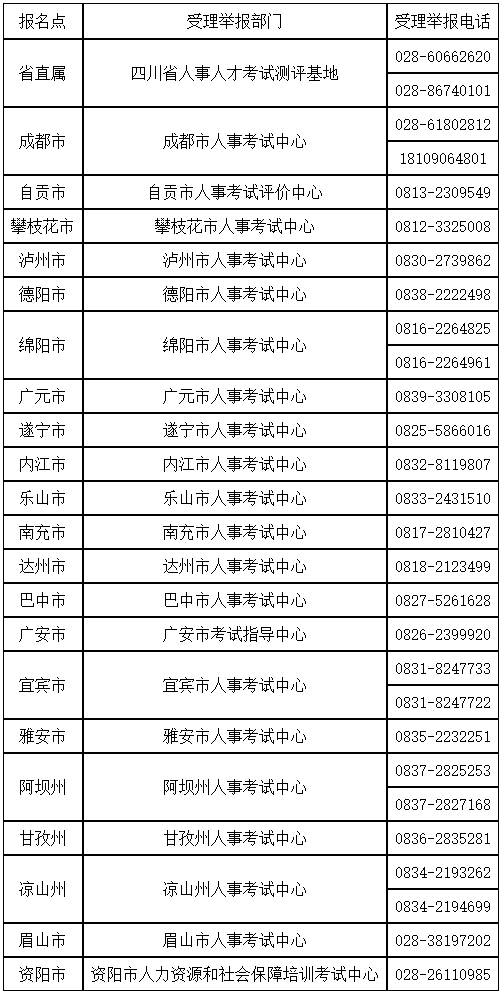 公示期间集中接受对拟取得成绩合格证明人员的监督举报,对虚假承诺行为,一经查实,将按相关规定处理。各报名点所在地受理举报部门及受理举报电话如下: