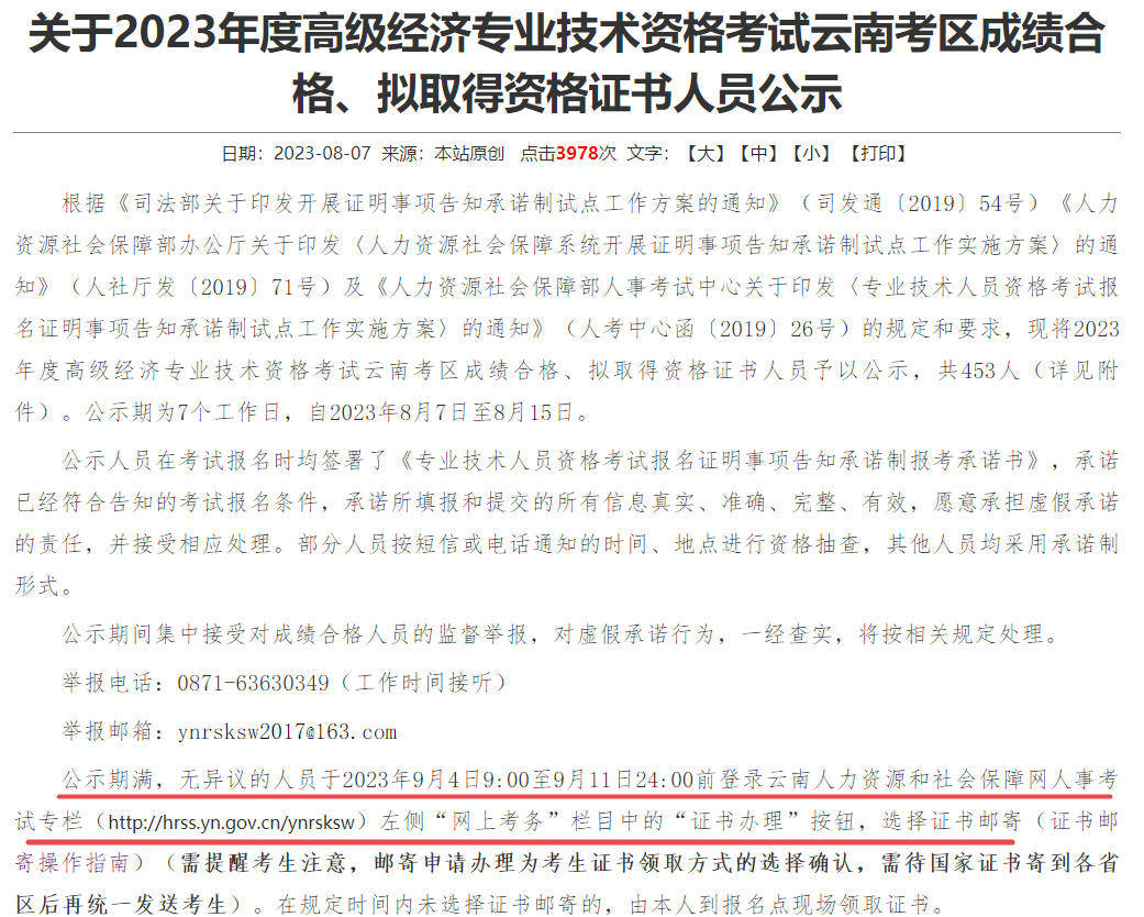 云南:公示期满,无异议的人员于2023年9月4日9:00至9月11日24:00前登录云南人力资源和社会保障网办理证书邮寄。