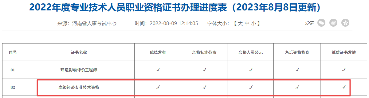 河南2023年高级经济师合格证明办理进度已公布,已到纸质证书发放阶段,截图如下: