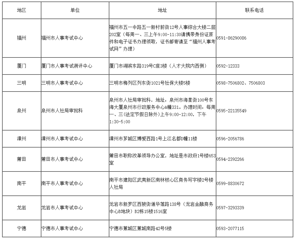 省直考区(准考证上报名地市:省直)的考生于每周一、三上午携带身份证原件到省人力资源和社会保障厅行政服务中心(地址:福州市鼓楼区思儿亭路11号2楼服务大厅,联系电话:0591-83568375)办理。需代领证书的,应出示考生本人、代领人双方身份证原件。需邮寄证书的,可登录“福建省人事考试网”点击“证书邮寄”栏申请证书邮寄服务,邮寄费用自理(该“证书邮寄”功能只针对在省直考区报考的考生,其余地市报考的考生请到所属考区咨询)。