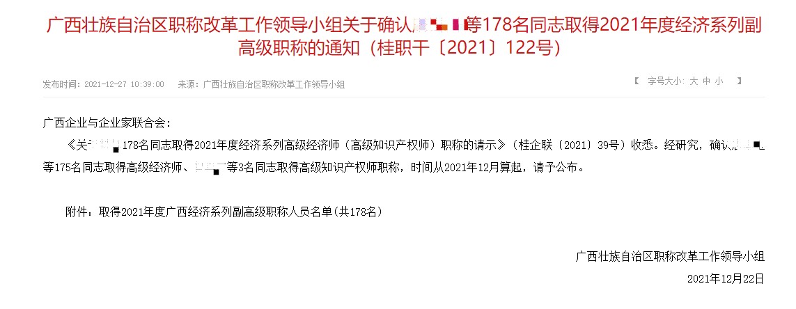 取得2021年度广西经济系列副高级职称人员名单(共178名)