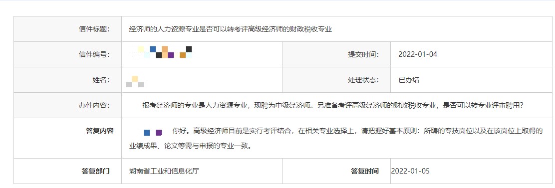 湖南考生咨询:报考经济师的专业是人力资源专业,现聘为中级经济师。另准备考评高级经济师的财政税收专业,是否可以转专业评审聘用?