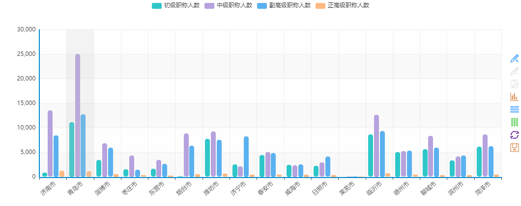 其中,济南市副高级职称人数:8445;青岛市副高级职称人数:12721;淄博市副高级职称人数:5867;枣庄市副高级职称人数:1438;东营市副高级职称人数:2636;烟台市副高级职称人数:6311;潍坊市副高级职称人数:7460;济宁市副高级职称人数:8230;泰安市副高级职称人数:4835;威海市副高级职称人数:2527;日照市副高级职称人数:4093;莱芜市副高级职称人数:28;临沂市副高级职称人数:9330;德州市副高级职称人数:5322;聊城市副高级职称人数:5905;滨州市副高级职称人数:4345;菏泽市副高级职称人数:6235。