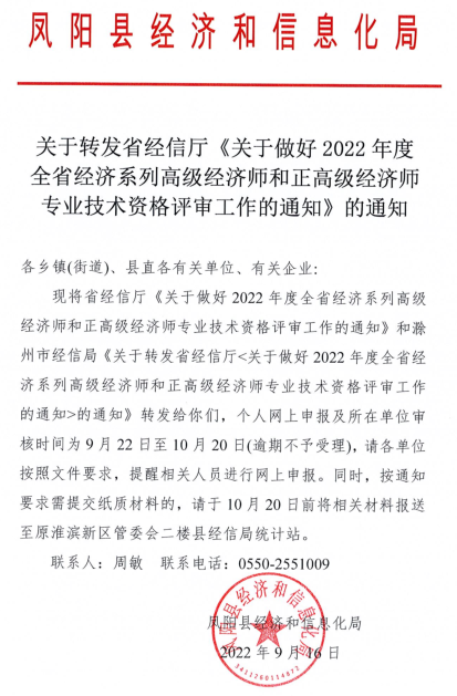 凤阳县经济和信息化局关于转发省经信厅《关于做好2022年度全省经济系列高级经济师和正高级经济师专业技术资格评审工作的通知》的通知