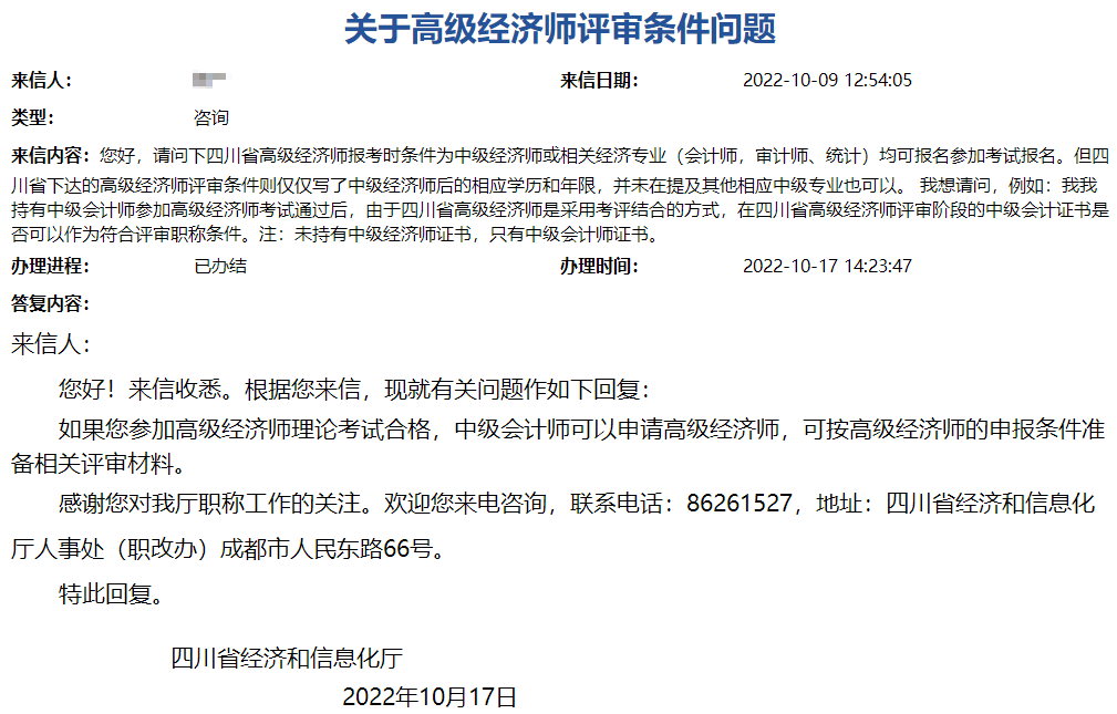 感谢您对我厅职称工作的关注。欢迎您来电咨询,联系电话:86261527,地址:四川省经济和信息化厅人事处(职改办)成都市人民东路66号。