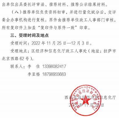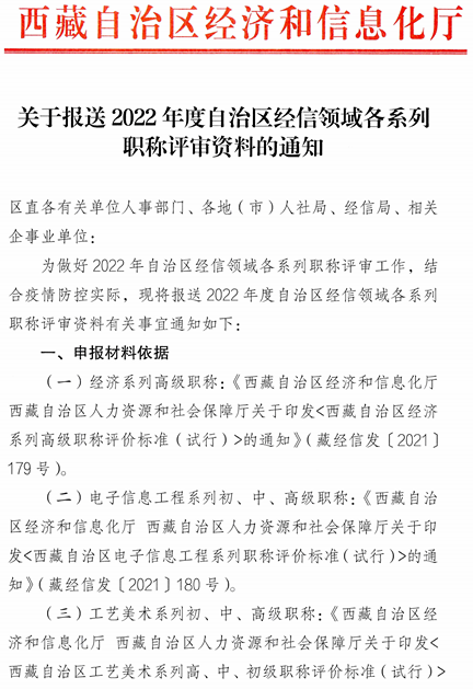 摘要:西藏自治区经济和信息化厅发布“关于报送2022年度自治区经信领域各系列职称评审资料的通知”,西藏2022高级经济师职称评审材料报送受理时间:2022年11月25日-12月3日,受理地点:区经济和信息化厅政工人事处。