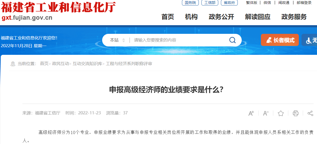 福建工业和信息化厅回复:高级经济师分为10个专业,申报业绩要求为从事与申报专业相关岗位所开展的工作和取得的业绩,并且能体现申报人员系相关工作的负责人。