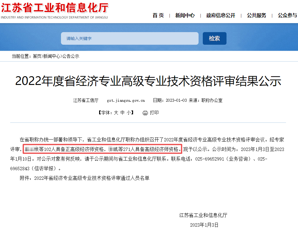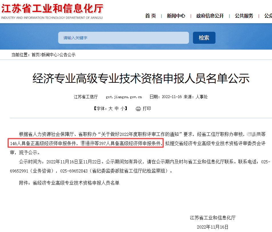 根据江苏省工业和信息化厅发布的<2022年度省经济专业高级专业技术资格评审结果公示>可知: