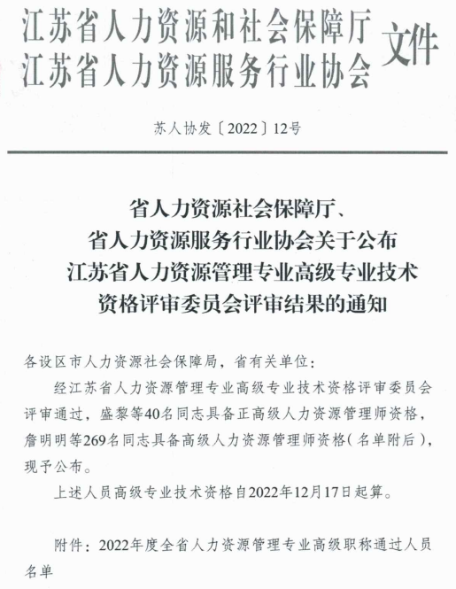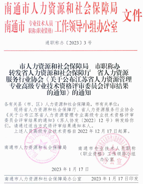 南通2022年高级经济师人力资源管理专业评审结果已公布,高级经济师资格自2022年12月17日起算。