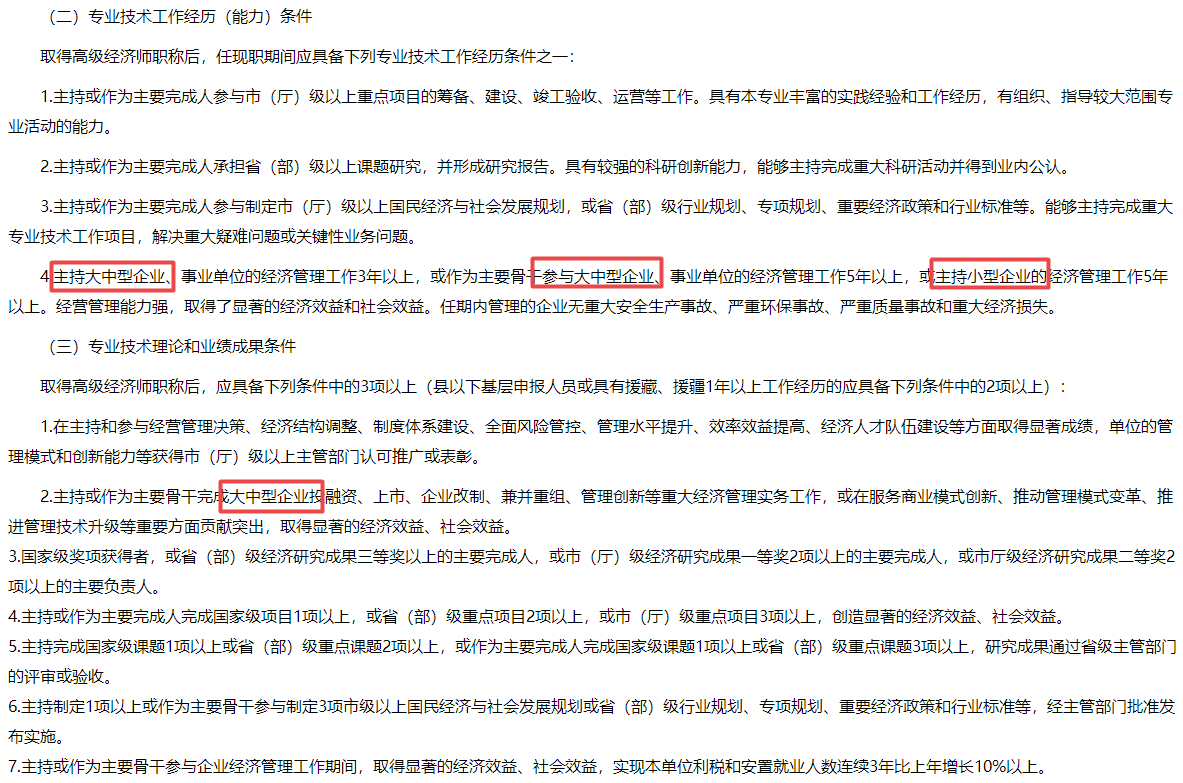 高级经济师评审条件中业绩、工作经验等经常会提及“主持大中型企业……”、“或作为主要骨干参与大中型企业……”、“主持小型企业的经济管理工作……”这样的要求。比如,陕西。