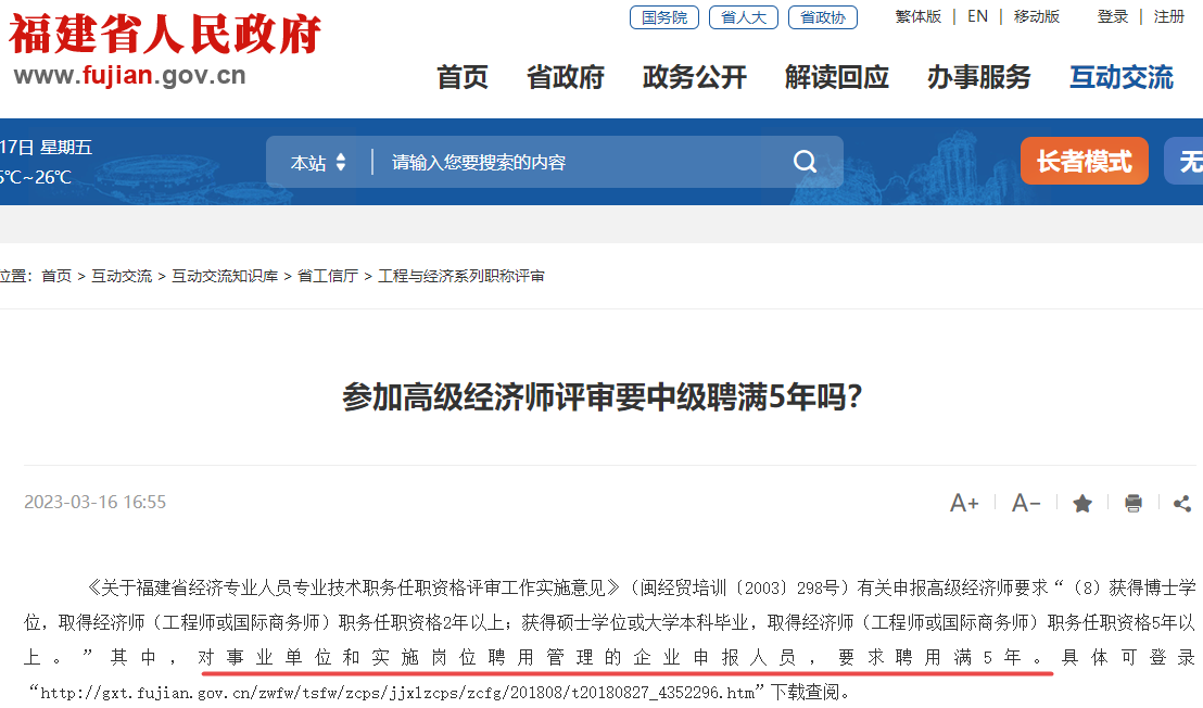 参加高级经济师评审要中级聘满5年吗?很多考生不是很清楚,快来看:福建省人民政府回复了~
