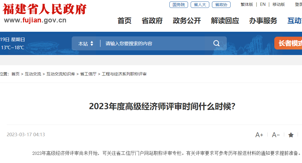 以下是福建省人民政府回复的“2023年度高级经济师评审时间什么时候?”问题截图: