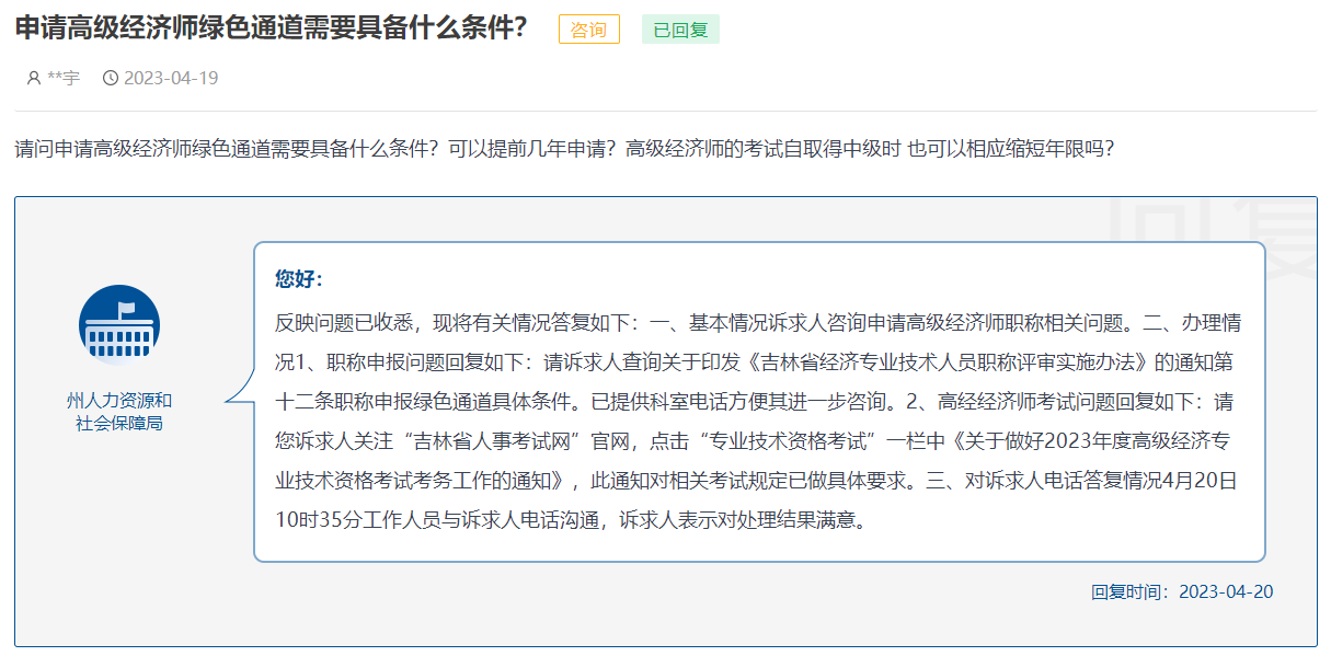 1、职称申报问题回复如下:请诉求人查询关于印发《吉林省经济专业技术人员职称评审实施办法》的通知第十二条职称申报绿色通道具体条件。已提供科室电话方便其进一步咨询。