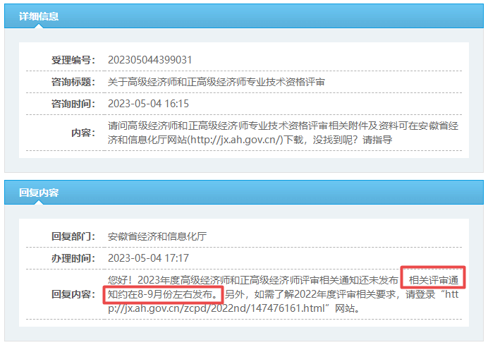 安徽省经济和信息化厅回复:2023年度高级经济师和正高级经济师评审相关通知还未发布,相关评审通知约在8-9月份左右发布。 另外,如需了解2022年度评审相关要求,请登录“zcpd/2022nd/147476161.html”网站。