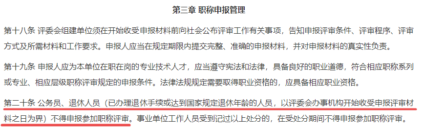 再如,山西:公务员、退休人员(已办理退休手续或达到国家规定退休年龄的人员,以评委会办事机构开始收受申报评审材料之日为界)不得申报参加职称评审。