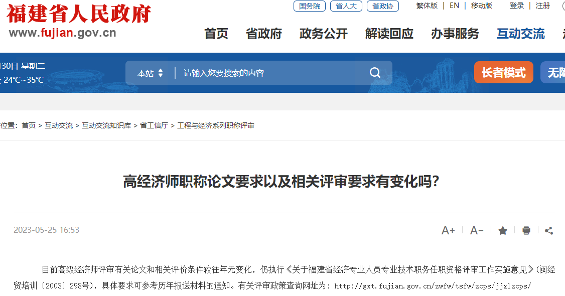 福建省人民政府回复:目前高级经济师评审有关论文和相关评价条件较往年无变化,仍执行《关于福建省经济专业人员专业技术职务任职资格评审工作实施意见》(闽经贸培训〔2003〕298号),具体要求可参考历年报送材料的通知。有关评审政策查询网址为: