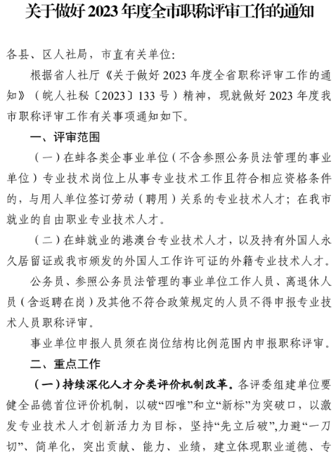 关于做好2023年度全市职称评审工作的通知(蚌人社秘〔2023〕106号)