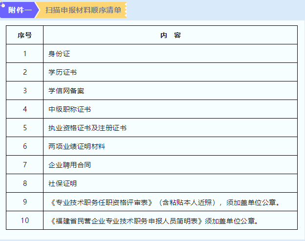 1.请各申报人员于2023年7月15日前将申报材料清单(附件一)按顺序扫描成PDF格式文件和《福建省民营企业专业技术职务申报人员汇总表》电子档一同发送至邮箱(邮件名以“高级+姓名+专业”命名)。现场收件以邮箱收到报名材料为准,申报材料未按规定时间发送到邮箱的视为逾期,现场收件一律不予受理。