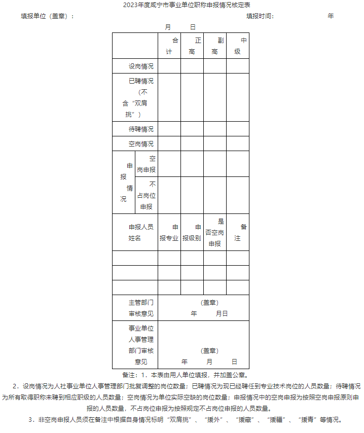 1.国有企事业单位专业技术人员,由用人单位对照相应职称系列或专业申报评审条件,进行审核、公示、推荐,按规定程序逐级报送。实行岗位管理的事业单位一般应在岗位结构比例内按岗申报,推荐人员参加职称评审时填写《2023年度咸宁市事业单位职称申报情况核定表》(附件1)。