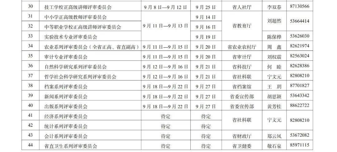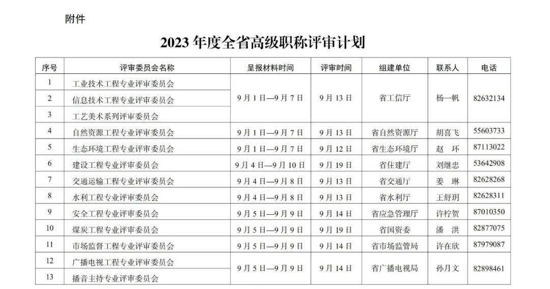 一、今年全省职称评审工作于7月启动,高级职称评审时间由省里统一安排(附件)。已经下放的高级职称以及中级职称评审时间由各地各单位自行安排,其中市(地)须在8月底前报送承接的高级职称评审计划安排,自主评审企事业单位高级职称评审时间须提前一周上报省人社厅事业处,全省年度职称评审工作应于2023年12月底前结束并完成结果备案工作。参评人员所有申报材料认定截止日期为2023年8月31日,任职资格从2023年9月1日开始计算。