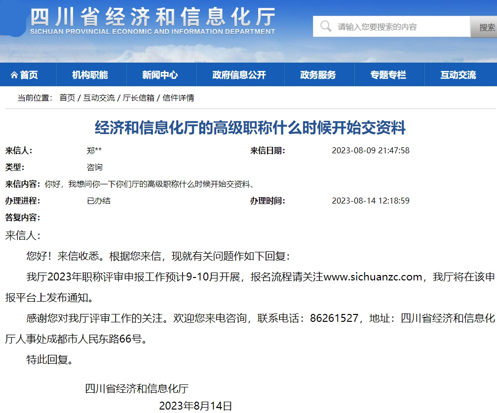 四川省经济和信息化厅回复:2023年职称评审申报工作预计9-10月开展,报名流程请关注