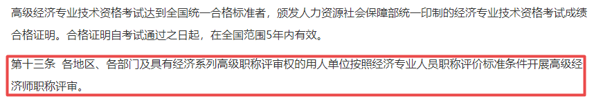 根据<人社部:经济专业技术资格规定和经济专业技术资格考试实施办法通知>第十三条可知,各地区、各部门及具有经济系列高级职称评审权的用人单位按照经济专业人员职称评价标准条件开展高级经济师职称评审。