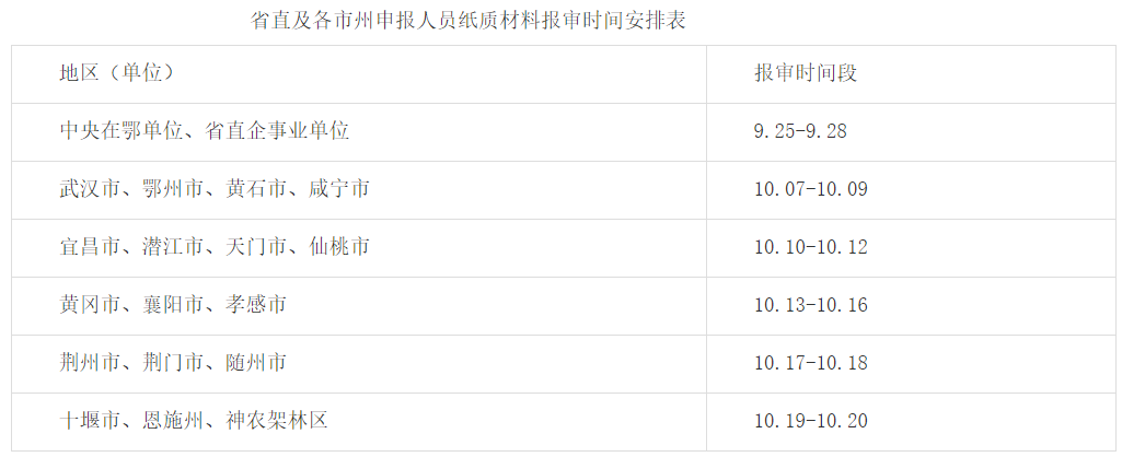 省直及各市州申报人员纸质材料报审时间安排表