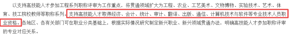 在《人力资源社会保障部关于进一步加强高技能人才与专业技术人才职业发展贯通的实施意见 人社部发﹝2020﹞96号》文件提及:支持高技能人才取得经济、会计、统计、审计、翻译、出版、通信、计算机技术与软件等专业技术人员职业资格。