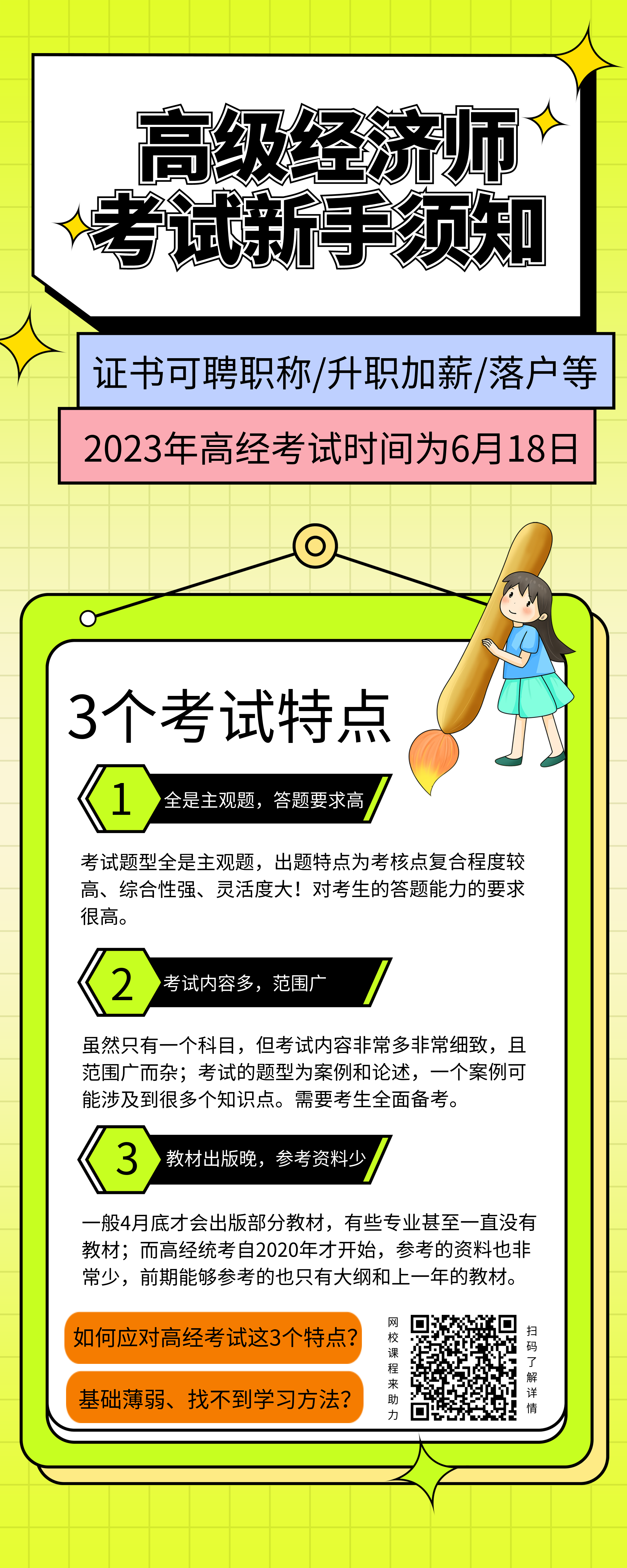 2023年高级经济师考试时间已确定为6月18日,报名也预计在4月进行,关于高级经济师考试,很多新手考生不是很清楚,快来看下图,这3个考试特点,你一定要知道!