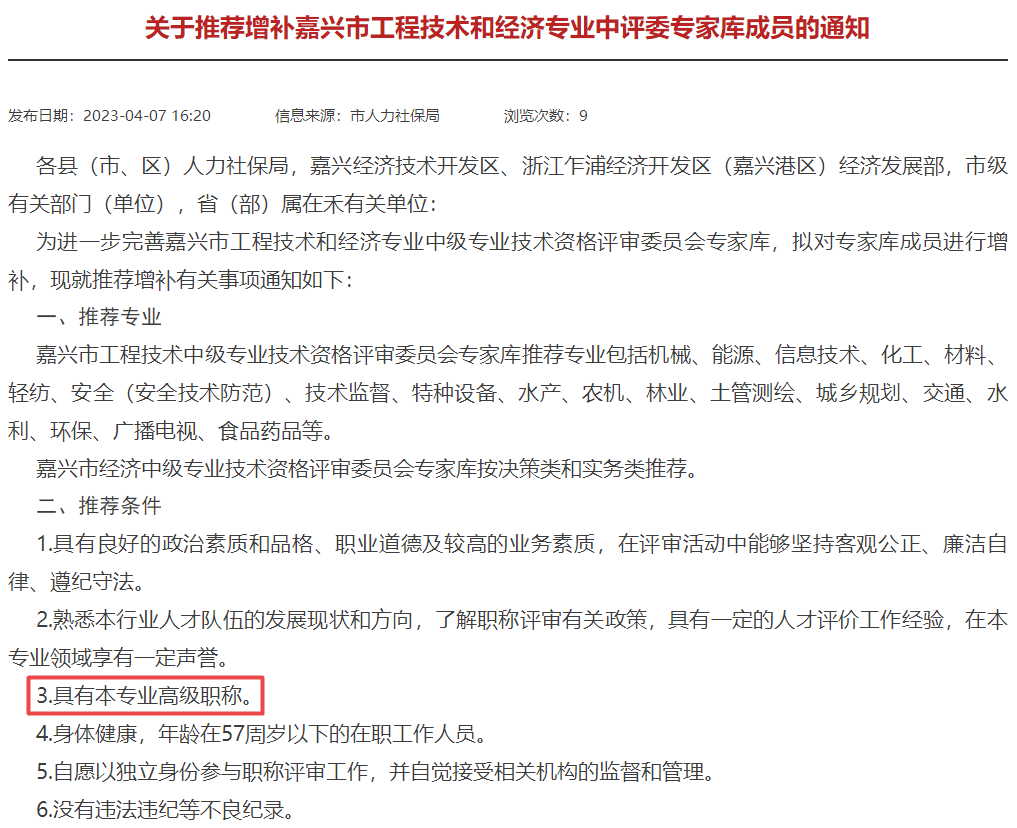 好消息!有高级经济师职称有机会被推荐增补嘉兴经济专业中评委专家库成员!截图如下: