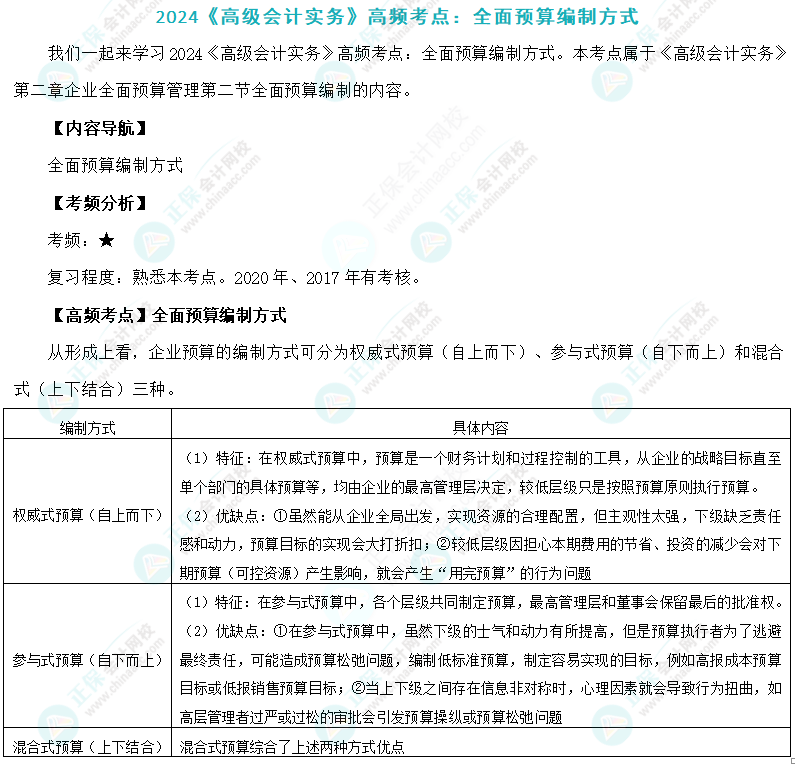 2024年高级会计师考试高频考点:全面预算编制方式