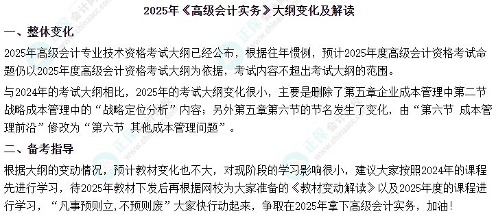 2025年高级会计专业技术资格考试大纲已经公布,高会考试使用全国会计专业技术资格考试领导小组办公室制定的2025年度会计资格考试大纲。