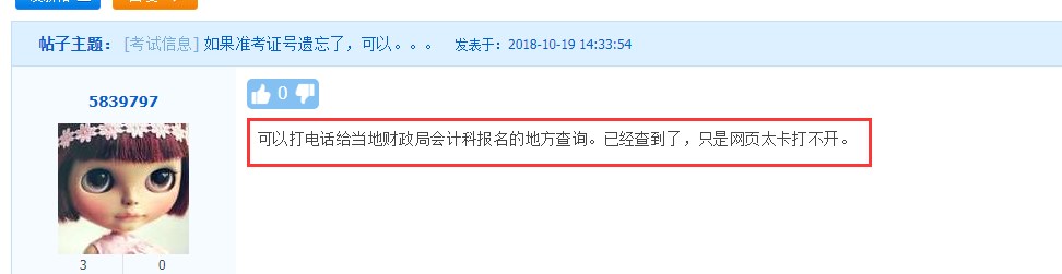 网校学员第一时间给出解决办法:给当地财政局会计科报名的地方查询准考证号即可!