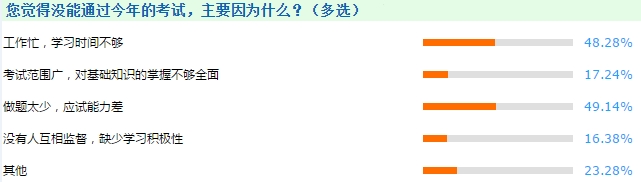 想要顺利通过高级会计师考试,用足了时间和精力夯基础是一方面,另一方面,好的应试能力也是必不可少。如下图正保会计网校推出的调查问卷显示,认为考试失败和实战经验欠缺、应试能力差有关的考生占最大比例,学习时间不够位居第二。