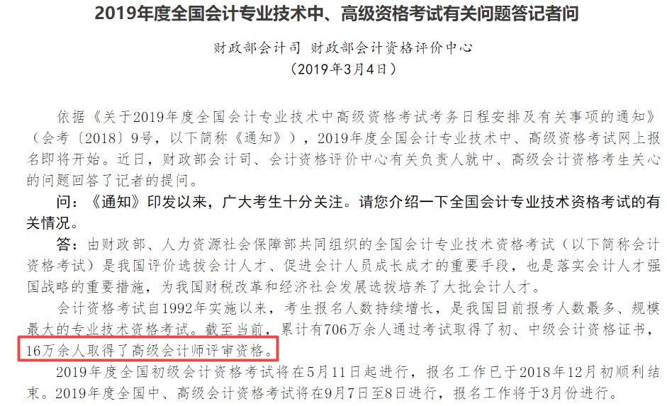 而在之前全国会计资格评价中心2019年中高级会计资格考试有关问题答记者问中提到:截至当前,已有16万人取得了高级会计师评审资格。