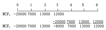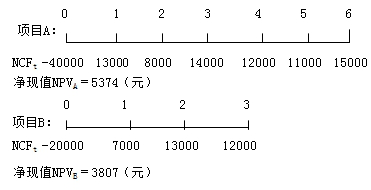(1)假定B项目重复一次,将年限延长至6年,然后再将其净现值与项目A净现值进行比较,图示如下: