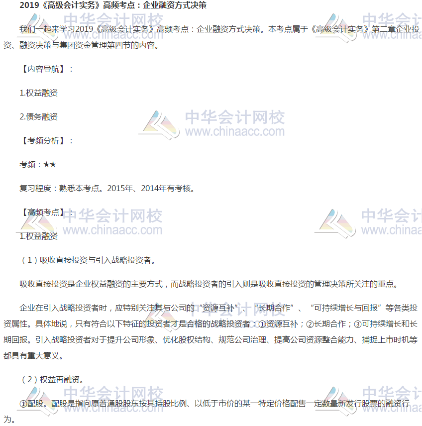 时间飞逝,尽早备考,机会总是留给有准备的人。大家要抓住这段备考的黄金时间,不要白白浪费哦!正保会计网校特为大家整理了2019年高级会计职称考试《高级会计实务》高频考点:企业融资方式决策。希望可以给大家的备考有一定的帮助!祝大家学习愉快!