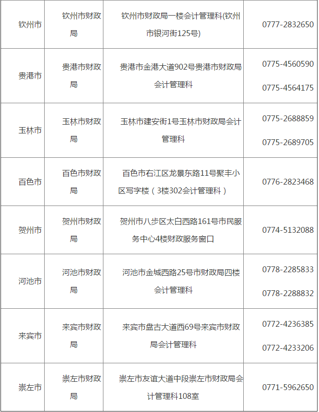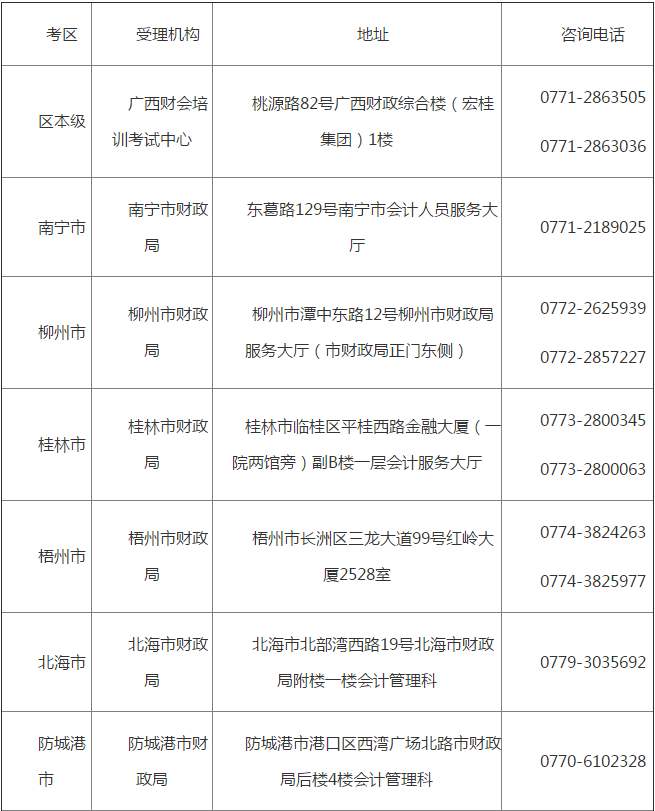 答:考生可以在考后资格审核通知中查询考试所在地当地财政局电话进行咨询,其中在南宁市考试的考生,考试学校在广西财经学院(明秀校区)和广西广播电视大学的考生对应考区是区本级,其余南宁市的考点学校考区请填写南宁市考区。